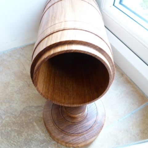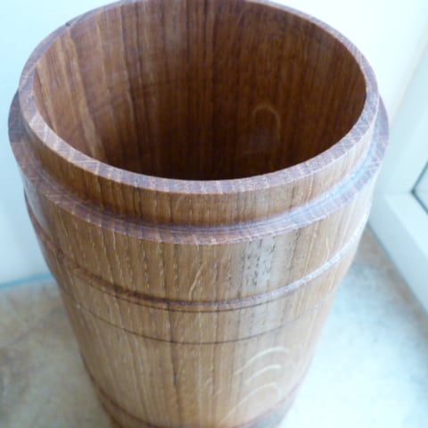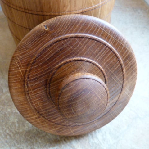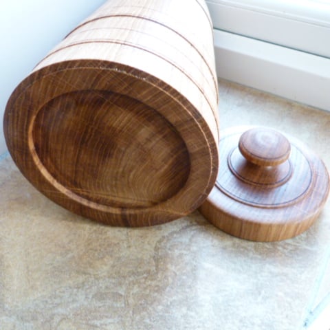 THIS BISCUIT BARREL IS MADE FROM ONE PIECE OF SOLID OAK. IT STANDS 12'' HIGH AND IS 5-1/2''WIDE AT THE BASE, THE WIDEST POINT. I LIKE TO MAKE CONTAINERS THEY CAN HAVE SO MANY USES , NICE TO HAVE THE GRAIN OF THE LID MATCH THE BODY. THIS PIECE OF OAK WAS 6'' SQUARE BEFORE I STARTED TO TURN IT, UNUSUAL TO GET WOOD OF THIS SIZE DRY ENOUGH TO MAKE A BOX, CAME OUT WELL.