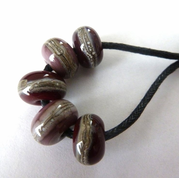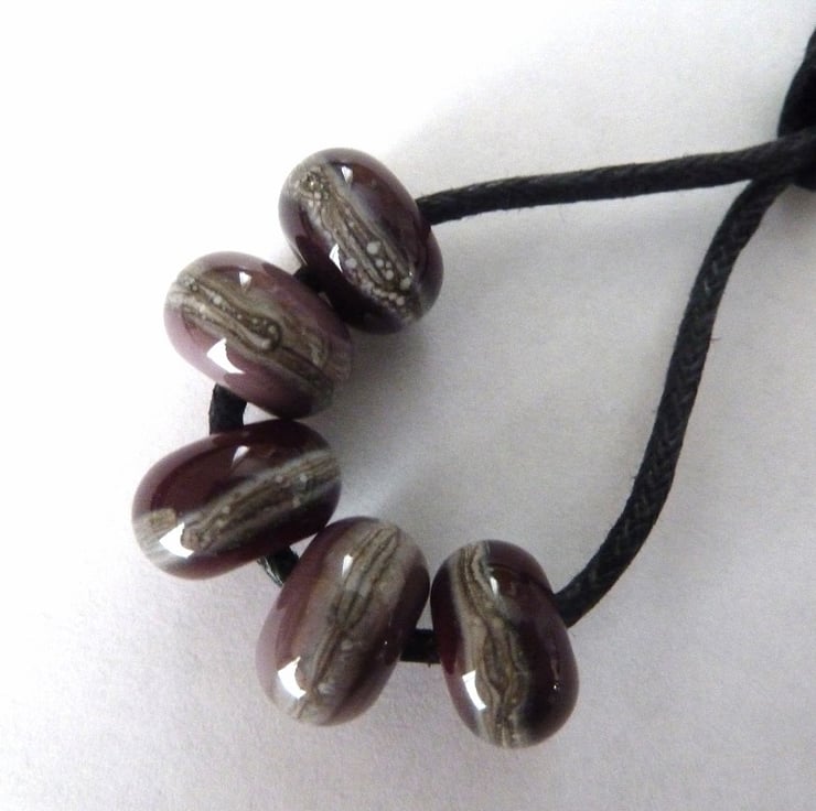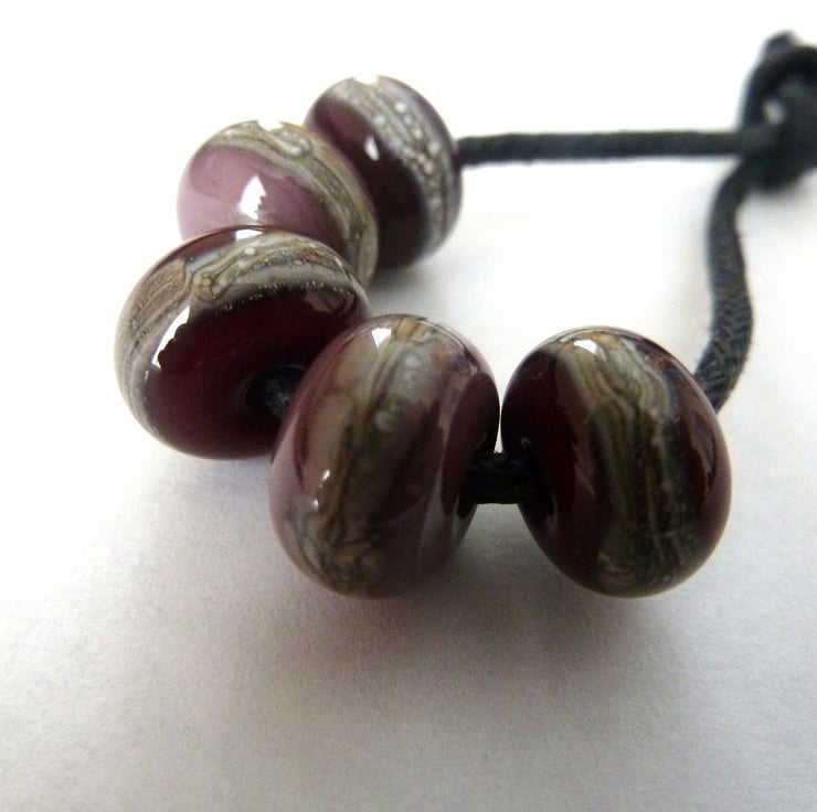 A set of 5 handmade lampwork glass beads which feature beads made with purple and red/purple glass, they have been wrapped with silvered ivory to give a sand effect.