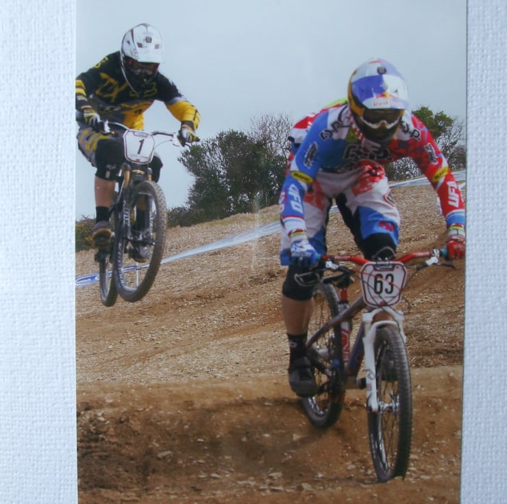 6" x 4" photo of two competitors racing down the 4X track at Pennance Mill, near Falmouth. This photo is mounted on white textured card, with a blank inner, left plain for you to add your own personal message. An envelope is included.