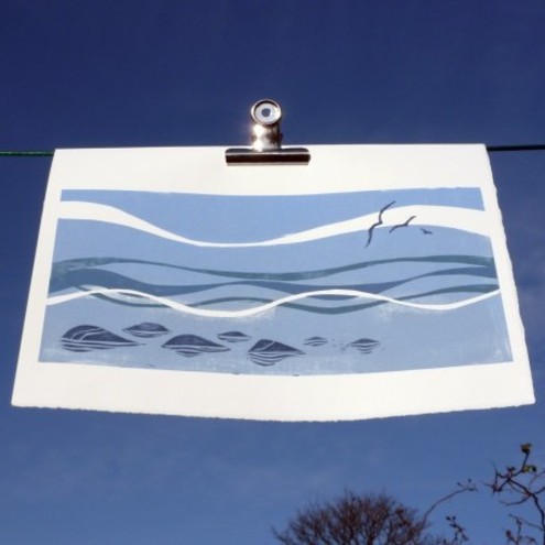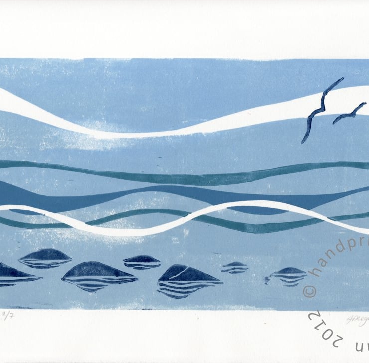 An original lino cut print (numbered 2 of 7). Printed in four colours from a hand-cut reduction lino "plate" with water-based inks on to high quality paper. Print size approximately 15x30.5cm. These items are hand-printed and so vary slightly depending on ink density, character of the paper, pressure of the press and the way the wind blows (ok, maybe not the last bit).