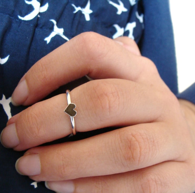 The teeny heart has been cut by hand, soldered to a silver band and then oxidised to contrast to the shiny ring base.