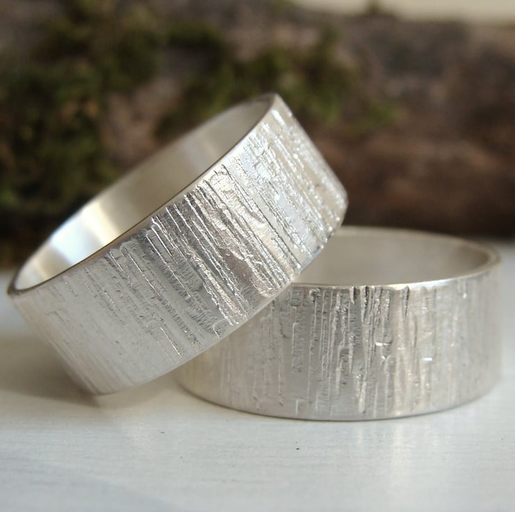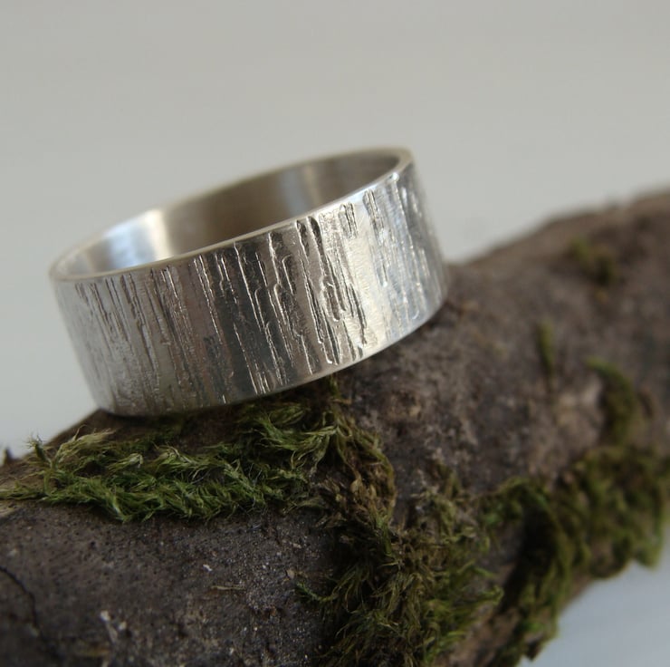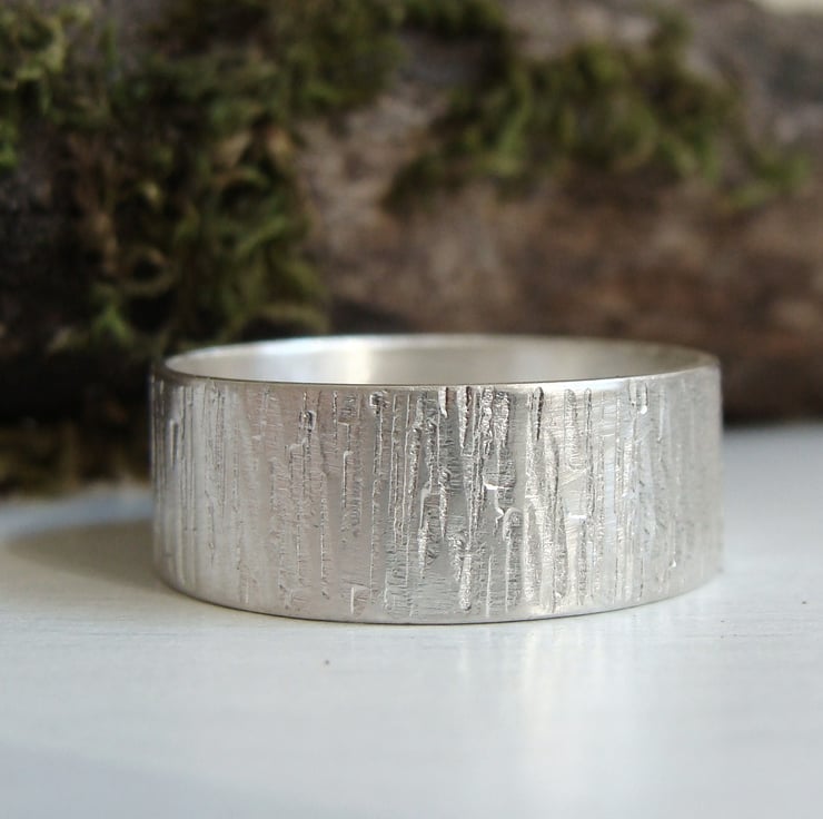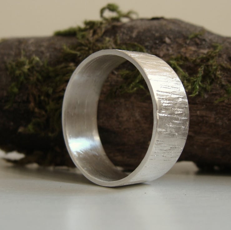 A wide band with a rustic, beaten texture similar to that of tree bark. Very natural, organic looking all cut, soldered, textured and polished by hand.