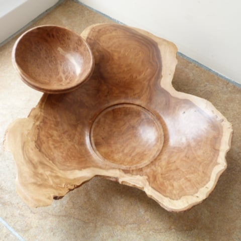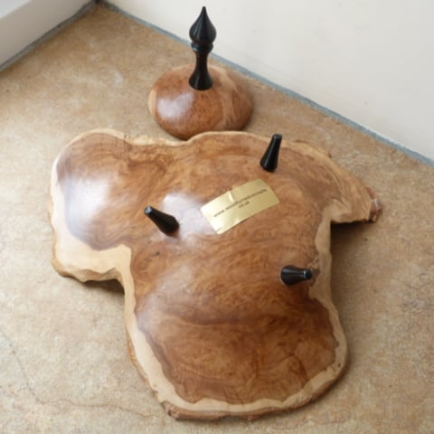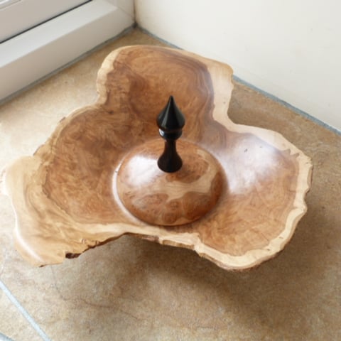 MADE OF A RARE AUSTRALIAN WOOD '' YORK BURR'' THIS INTERESTING PETITE LITTLE LIDDED BOWL HAS THREE LEGS MADE EBONY WITH A FINIAL-HANDLE TO MATCH. THE PALER EDGES TO THE PIECE ARE ACTUALLY THE SAPWOOD OF THE TREE. FINISH WAS DANISH OIL AND CARNAUBA WAX. MAXIMUM DIAMETER 9'' HEIGHT 4-1/2''.