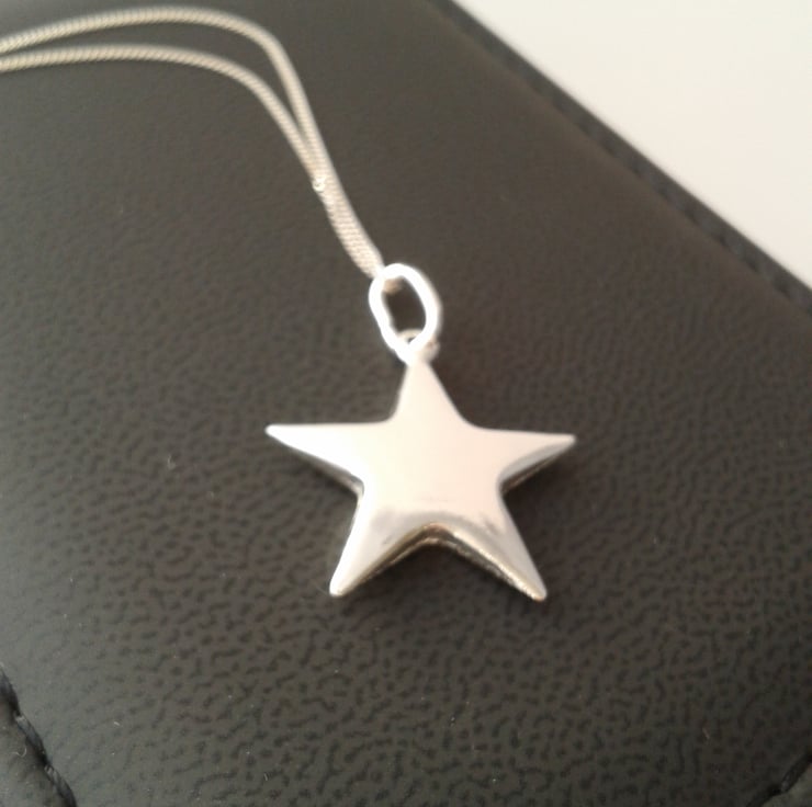 This solid sterling silver 5 pointed star hangs from an 18 inch delicate sterling silver chain, giving you a stylish yet simple pendant that will go with almost any outfit. The star measures approximately 22 mm in length, and because it is solid has enough weight to hang beautifully.