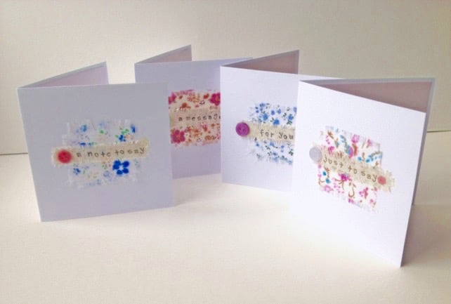 The listing is for a set of four handmade notecards, presented with envelopes and wallet to keep everything in.