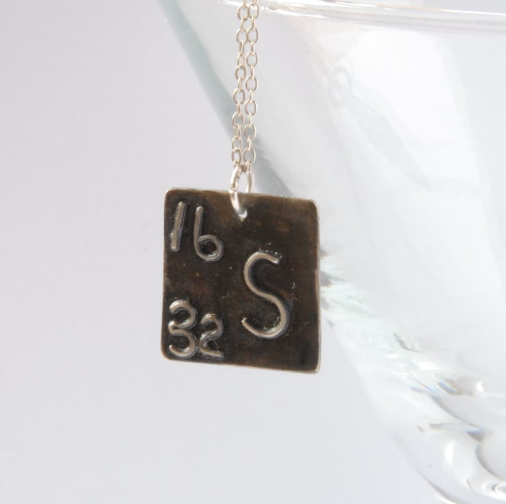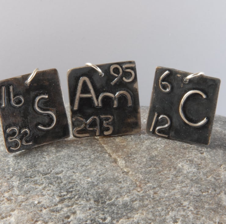This oxidised silver pendant features raised silver numbers and letters in the style of a periodic table tile - choose your initial or your favourite element. Ideal gift for the chemist in your life. If you are uncertain as to whether your initial is possible (and not everyone has periodic tables hanging around the house like me) drop me a message and I'll see what's closest (the chemist in me would prefer to stick to actual elements). This listing is for a single pendant if you would like an entire name which would be over several squares please drop me a message. Each one is hand made to order so there will be variation between pendants even if they are for the same element.