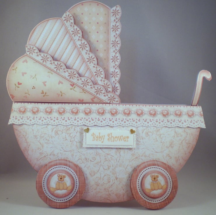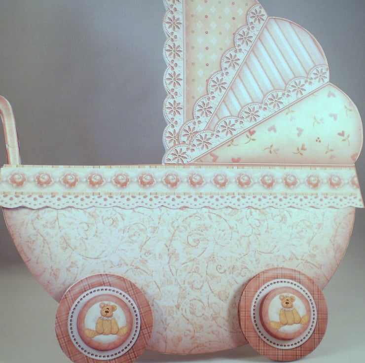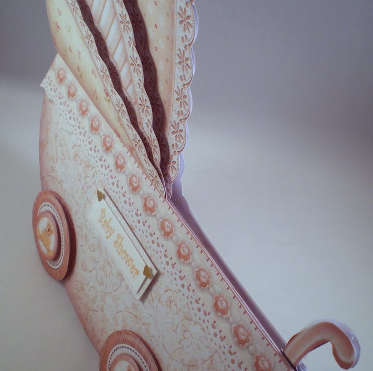 This lovely pram shaped card in neutral colours is suitable for a baby shower or can be adapted for the birth of a baby. The greeting is mounted on white glitter card and has little gold hearts added. I can easily change the wording.