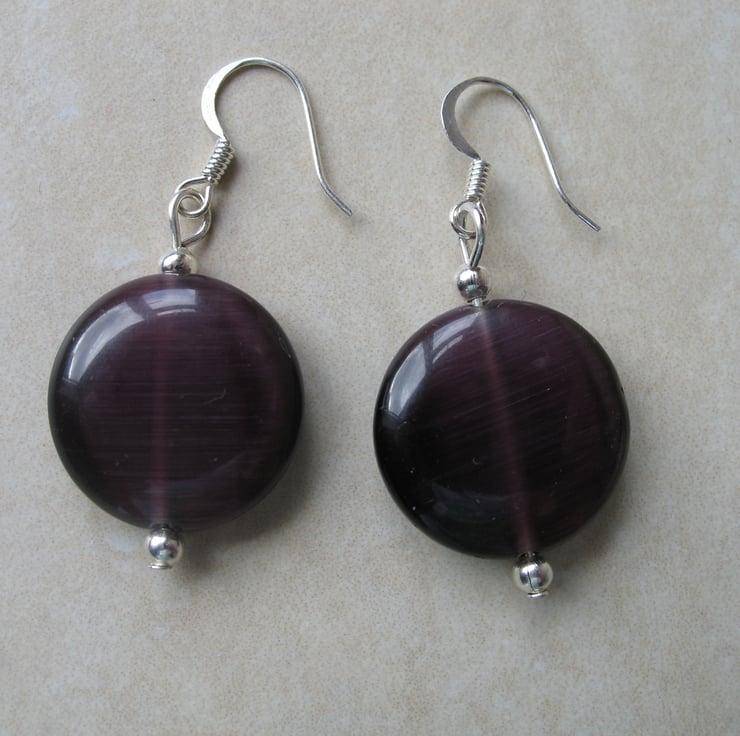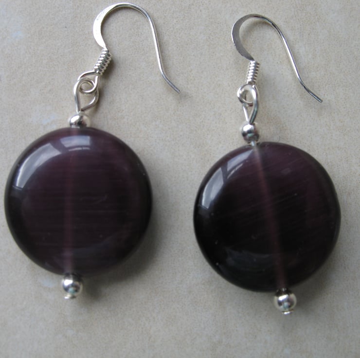Hi These beautiful purple glass bead earrings measure aprox the size of a 1p coin. They hang from a silver plated ear wire and will come in a lovely organza bag ready to be given as gift.