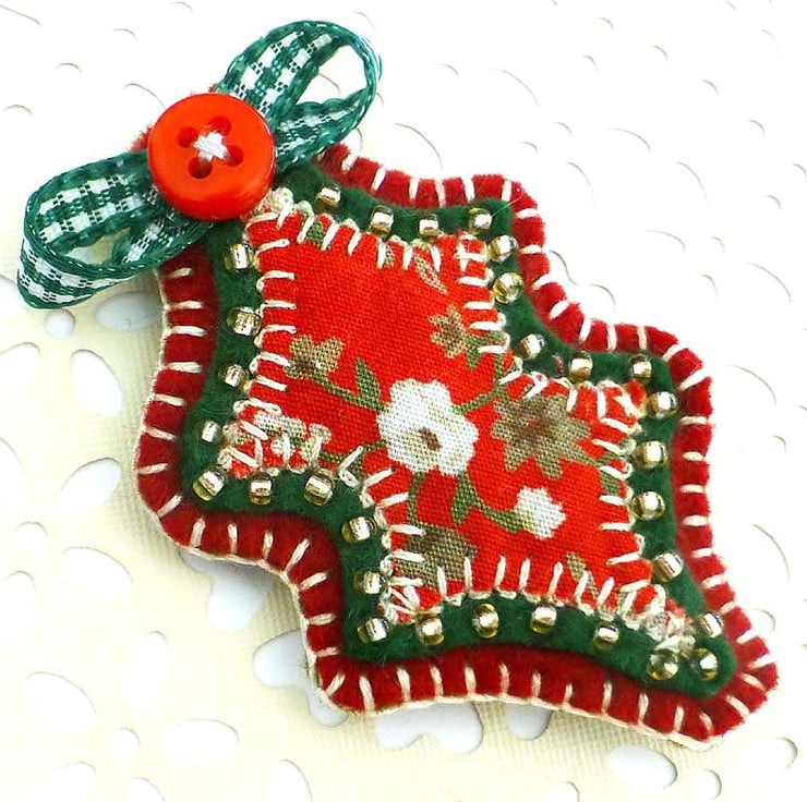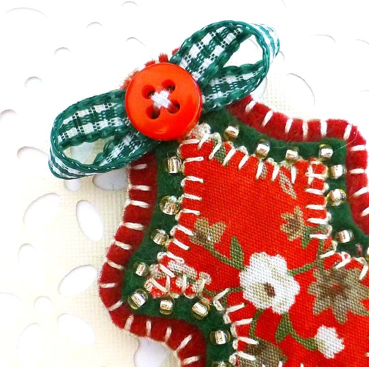 The leaf is in red festive cotton print fabric which has been appliqued onto green felt. It has been edged with gold coloured seed beads and is further mounted onto a dark red felt base which is finished with a red button berry and green gingham ribbon detail. There is a brooch pin on reverse side for easy attachment.