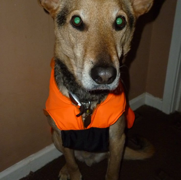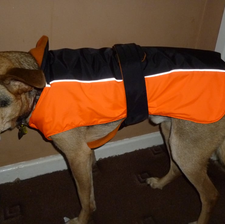A teeny little chest protector style in a small Chuahua type of size. Made in a black & hi visibility orange water proof fabric, with a fleece inner for warmth and a reflective strip running down the full length of both sides.