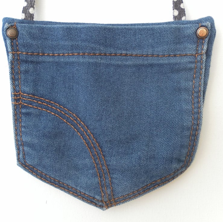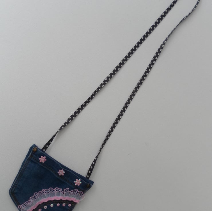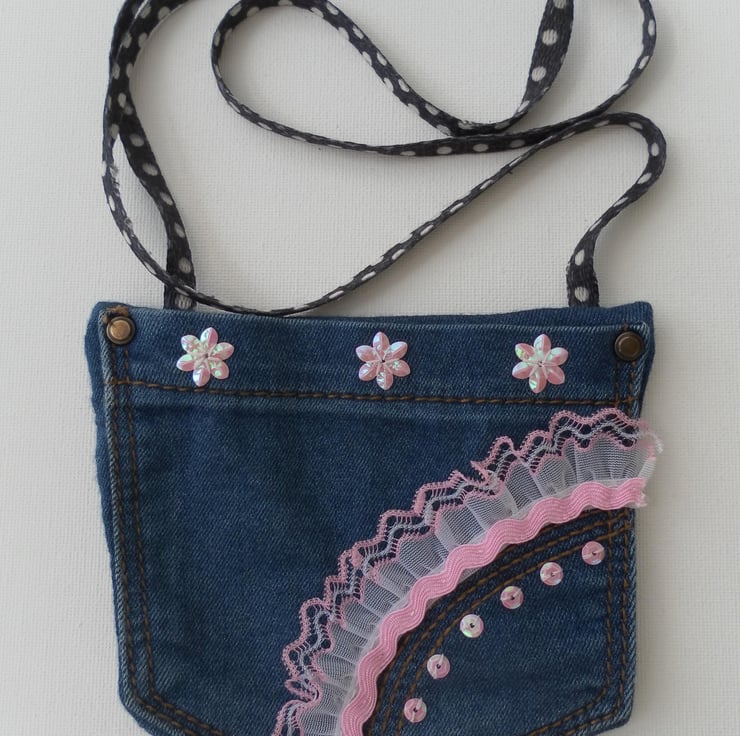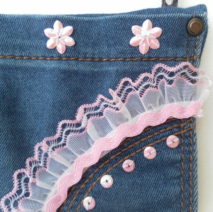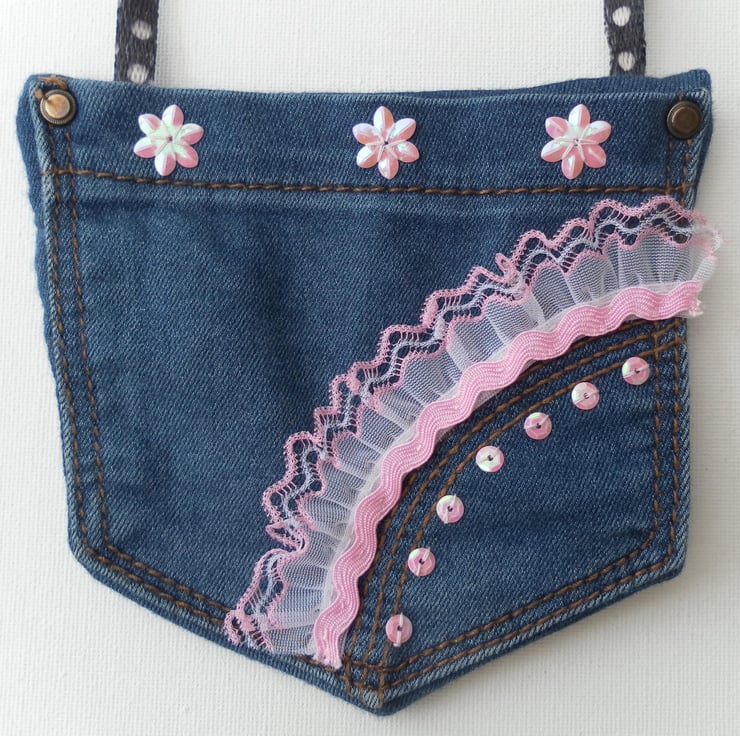 A perfect gift, this shabby chic bag is one of a kind. It is made from the back, patch pockets of a pair of jeans, simply sewn together, making two compartments. It is embellished with pretty pink and white lace, pink ric rak and pink sequins. The strap is dark blue tape with white dots and measures 93cm x 0.8cm. The bag measures 13cm x 12cm at the widest points.