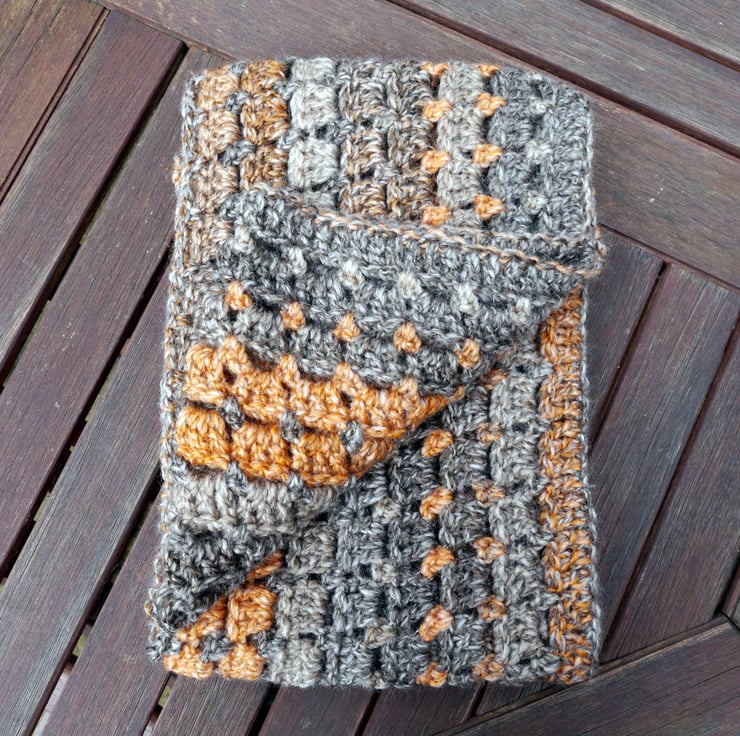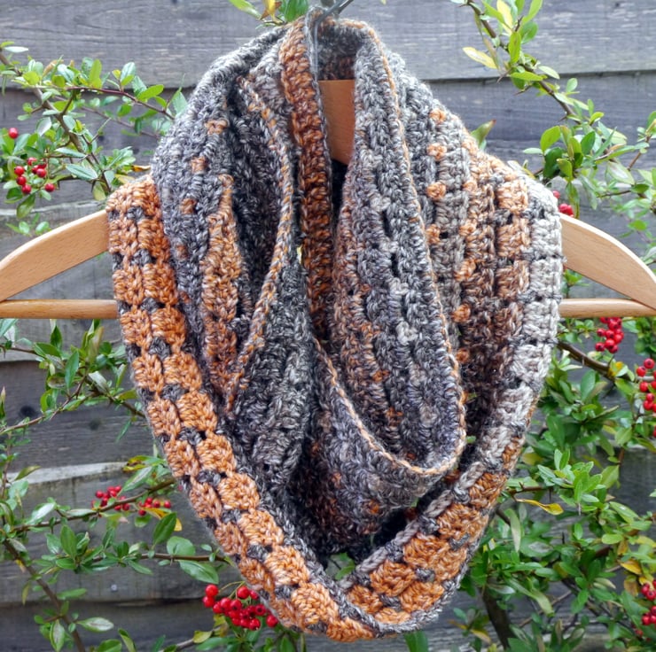 Soft, warm and cosy, this infinity scarf is perfect for the cold autumn days ahead. Hand crocheted with James C Brett Marble Chunky wool which gives a lovely marbled effect. Can be worn either looped once or twice around the neck.