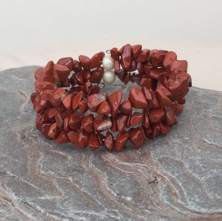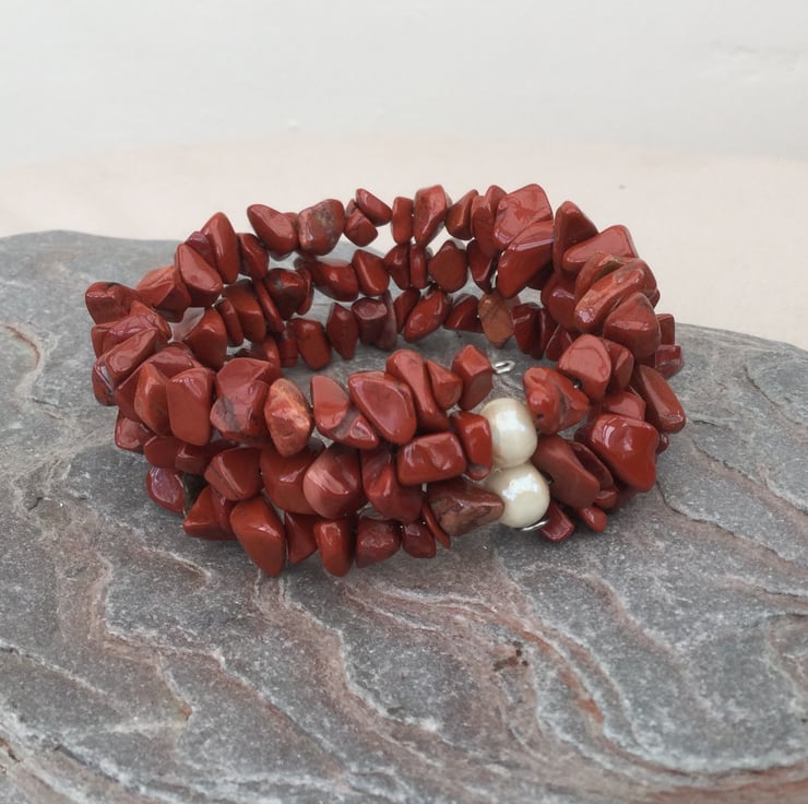 This lovely autumnal bracelet is made up of reddish brown nuggets of semi-precious red jasper, mounted on steel memory wire which wraps itself snugly round the wrist. One size fits all. Jasper is an opaque and fine-grained variety of quartz, the brick-red colour being due to the presence of iron oxide. In ancient times it was believed to relieve the pangs of childbirth.