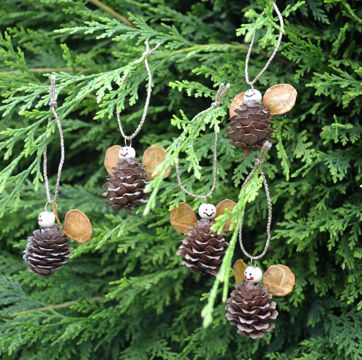 Each fairy has been made with a decorative pine cone, a smiley faced bead and beautifully crafted little glittered wings. They each have gold metallic loops to hang them up wherever you like. Each fairy measures approximately 4.5 cm in height (10 cm with string) and the wingspan is approximately 5 cm wide.