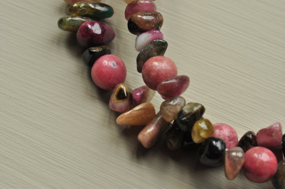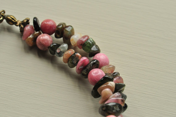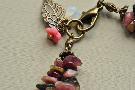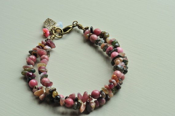 Handmade bracelet made using two strands of stunning Tourmaline gemstone chip beads with Rhodonite gemstone rounds finished with an antique bronze plated trigger clasp with dangle of antique bronze leaf charm and two Czech glass flower cups, one in pink and one opal finish.