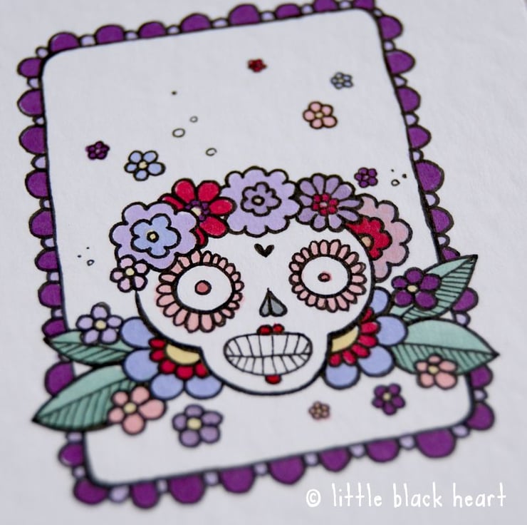 a sweet smiling lady skull with a floral crown and a fancy purple border.