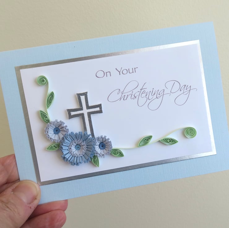 A very pretty quilled Christening card with quilling flowers in shades of pale blue. An original, distinctive handmade greetings card to celebrate a Christening or baptism.
