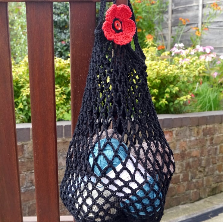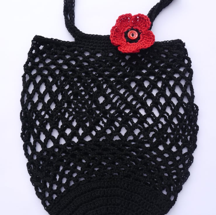 I have made this environment friendly crocheted market bag with good quality cotton and have attached a pretty flower embellishment. Just pop it in your handbag, car or under the pushchair and never forget a shopping bag again. It measures approx 30 cm wide by 32cm long when laid out flat but will expand generously when filled with goodies. Also useful for putting your knitting/crocheting projects in or even in a child's bedroom for soft toys etc.