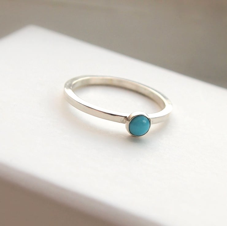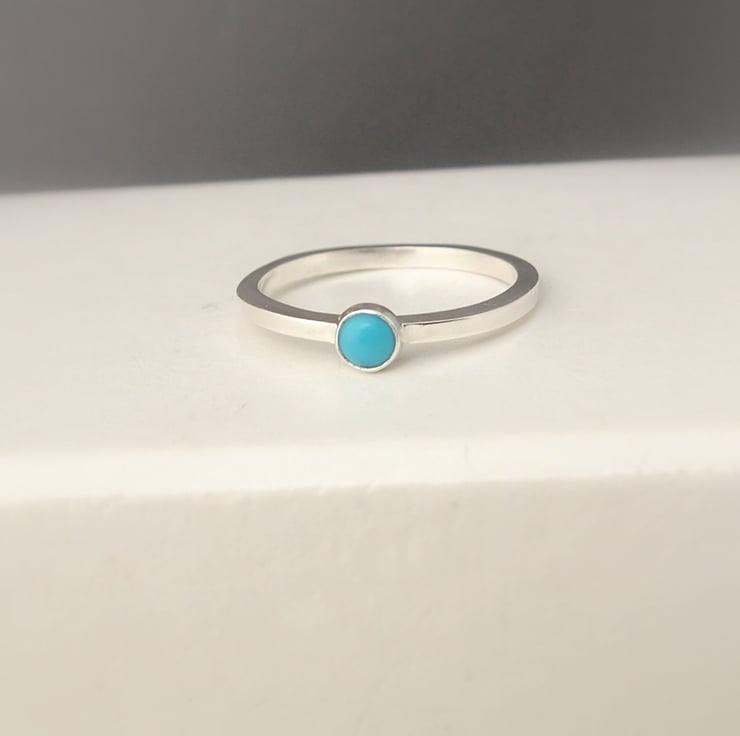 A small and delicate ring made from Sterling Silver and Turquoise. Made from a 4mm round cabochon with a band made from small square wire approx 1.5mm wide.