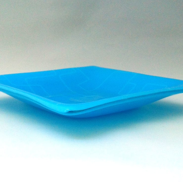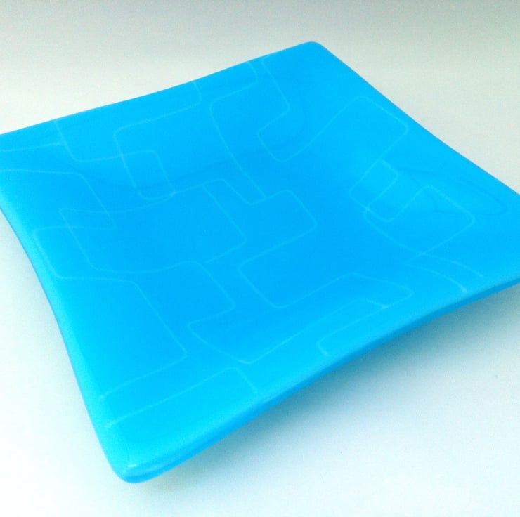 Handcut 15 cm" sq cyan blue glass and hand shaped white stringers kiln fused and then fired again to slump into this medium sized dish. The glass has been fully annealed in the firing process.