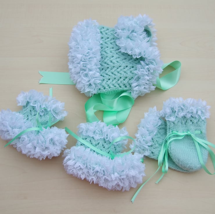 Hand knitted baby lace bonnet booties and mittens set 0 - 3 months mint green