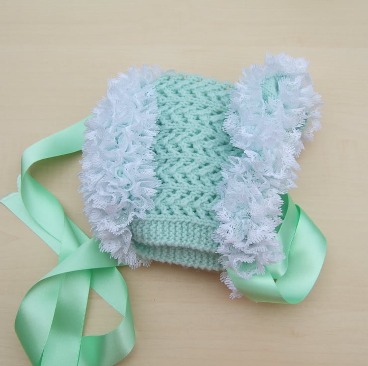 The bonnet has lace around the edge to frame the face and lots around the crown. It fastens under baby's chin with green double satin ribbon.