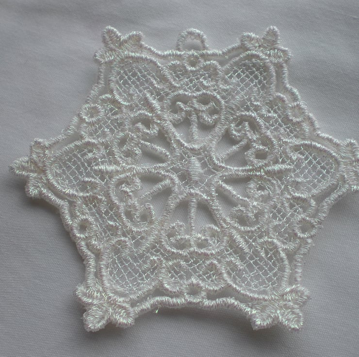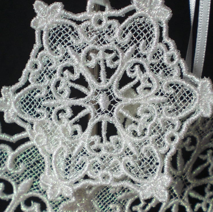 Set of 3 embroidered snowflakes in a beautiful mother of pearl finish thread, hanging on ivory satin ribbon.