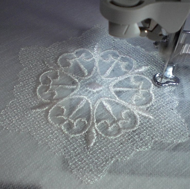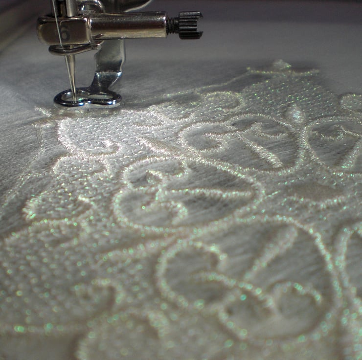 This thread is very difficult to photograph and tends to look white, but it is not. It's an ivory colour with a lovely mother of pearl sheen to it., which shows a little in the second photograph.