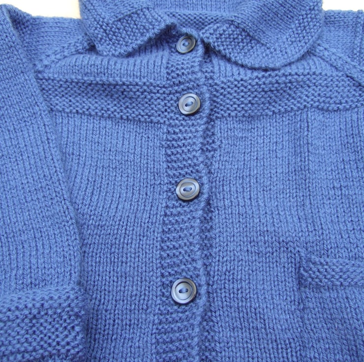 This children's cardigan has been hand knitted in a lovely blue shade called lagoon. It has a high round neck with collar and fastens down the front with blue buttons. There are pockets on the left and right front. Would look great with a pair of jeans for those Autumn walks in the park.