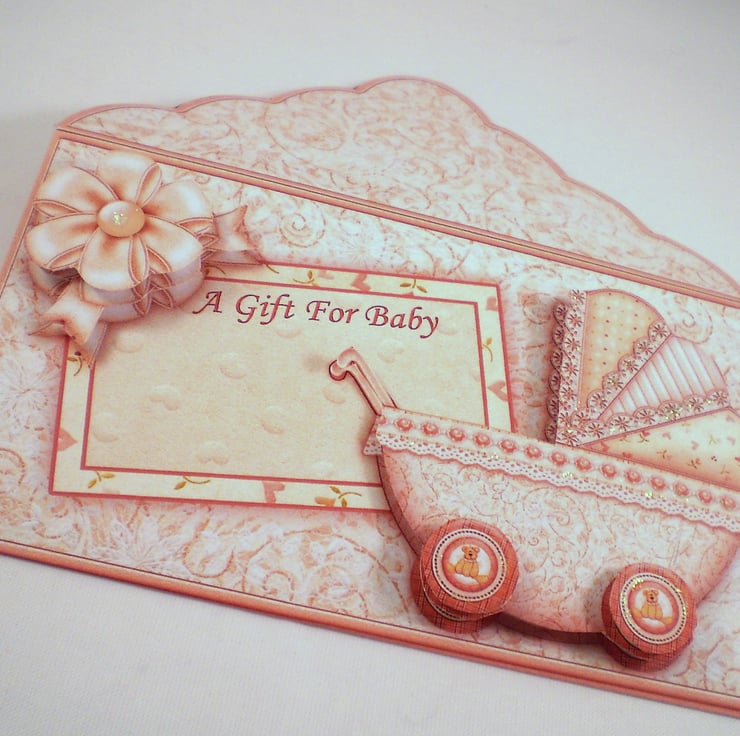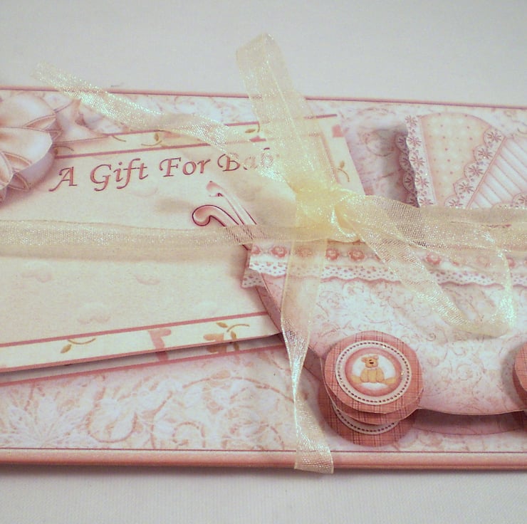The design is of a pram in neutral colours and I have made it slightly 3D. This wallet is made of card and inside is a pretty diecut heart shape with a gold chiffon ribbon which you can write on.