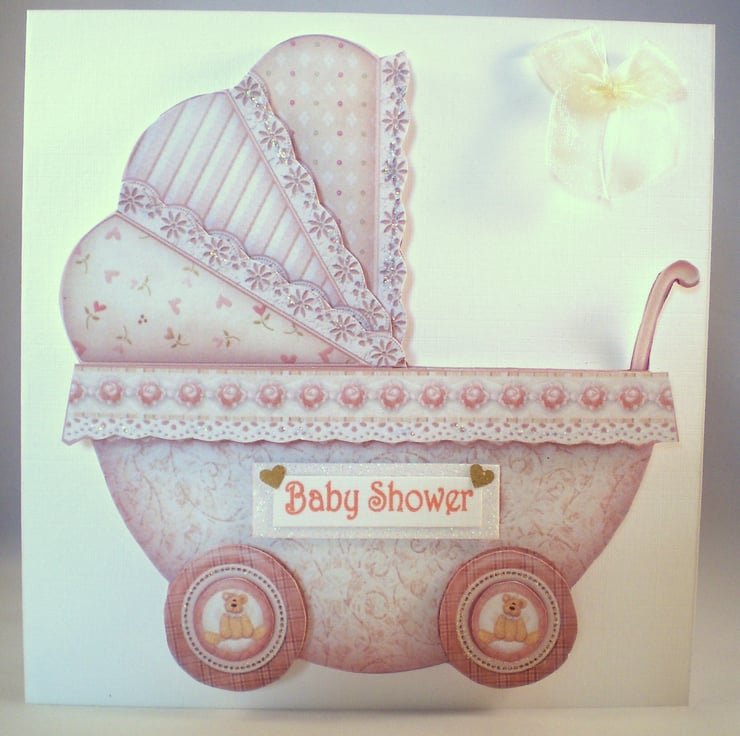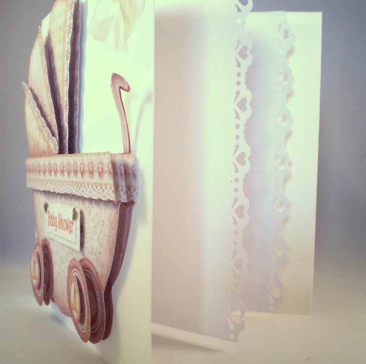 A white square card measuring 144x144mm (5.5x5.5in) features a 3D pram in neutral colours. I have made this for a baby shower but could make it for a new baby. I have added a chiffon bow and have left the white insert blank which has a heart decorative border