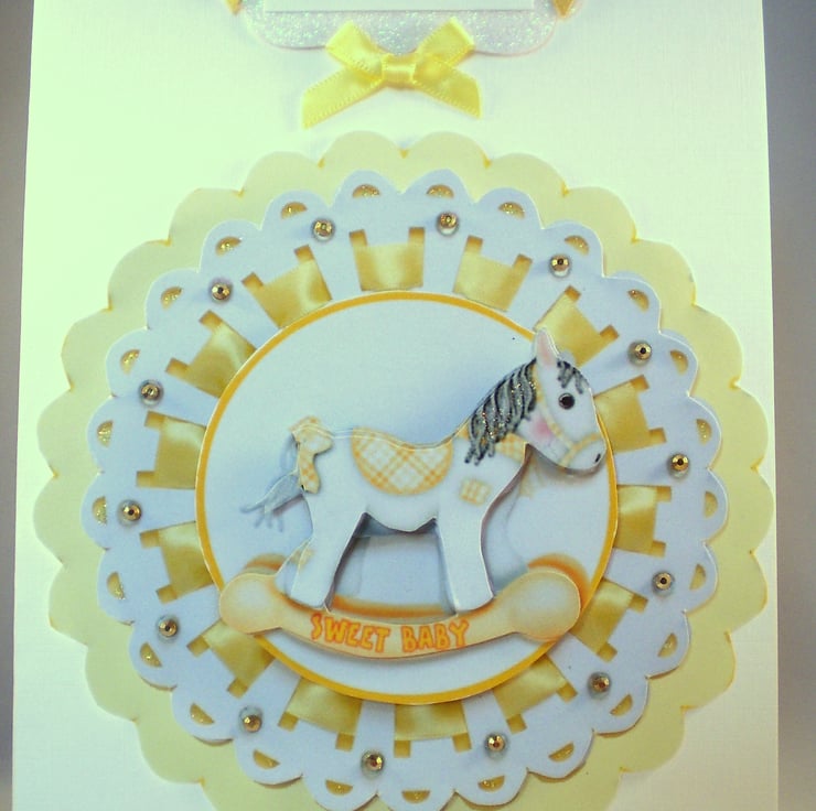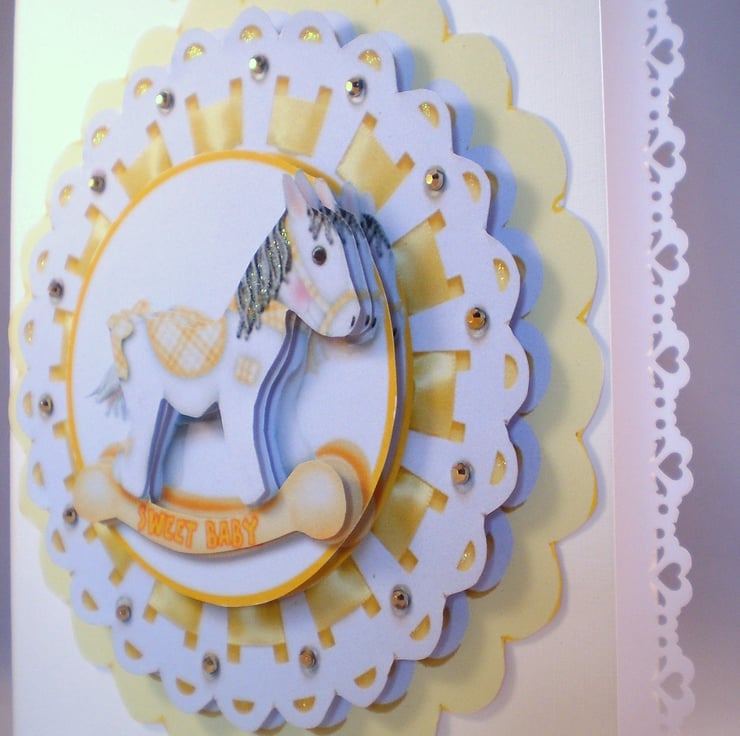 A white card measuring 150x210mm (6x8in) features a 3D design of a rocking horse. I have made this for a baby shower but could easily be adapted for a new baby.The blank Insert is white and has a heart decorative border