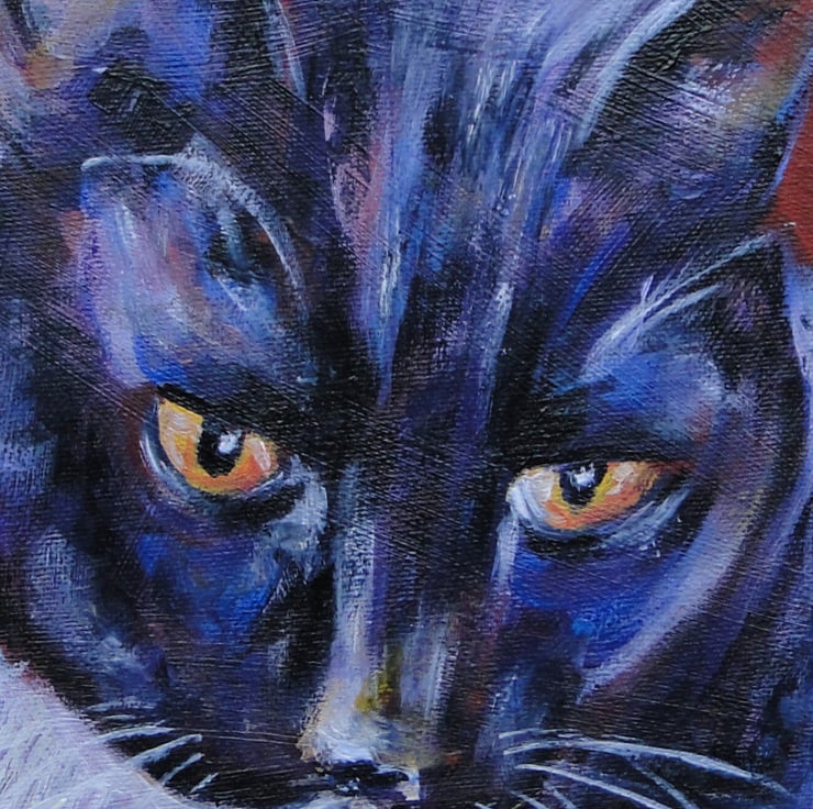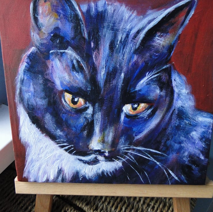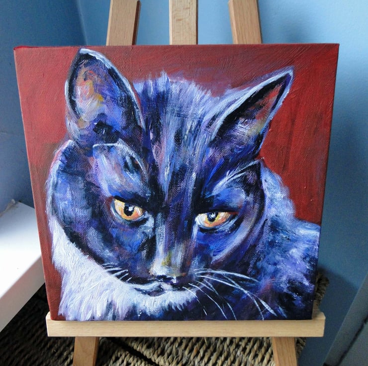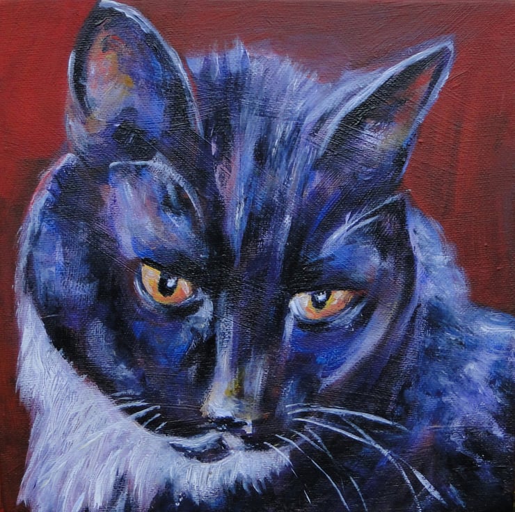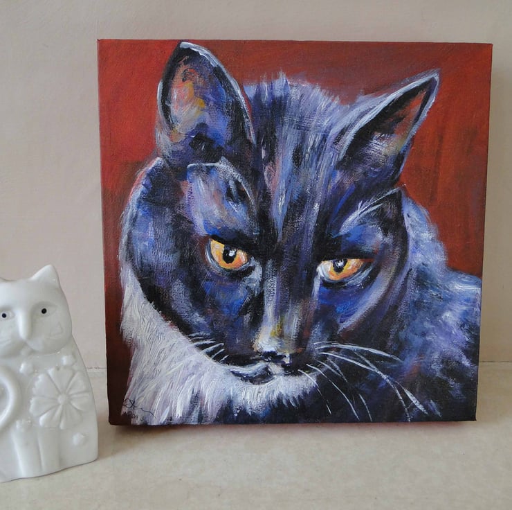 Original acrylic painting of a cat in acrylic paint on canvas. Sides of canvas painted dark red Signed on the bottom and the back of the canvas. Comes with an Artwork Certificate of Authenticity.