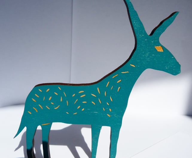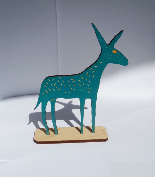 This is a large blue/teal donkey, laser-cut out of mdf with a cherry wooden veneer.