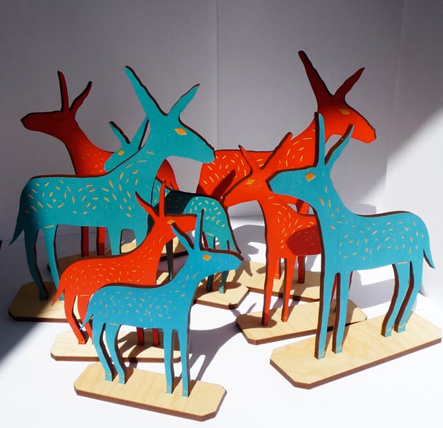 The donkey is painted on one side using block-printing ink, etched with a pattern and finished with a matt varnish to protect it.