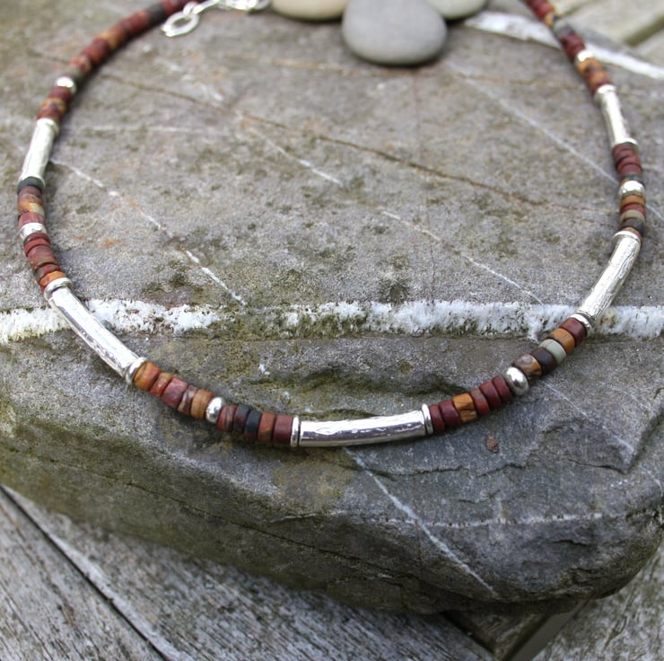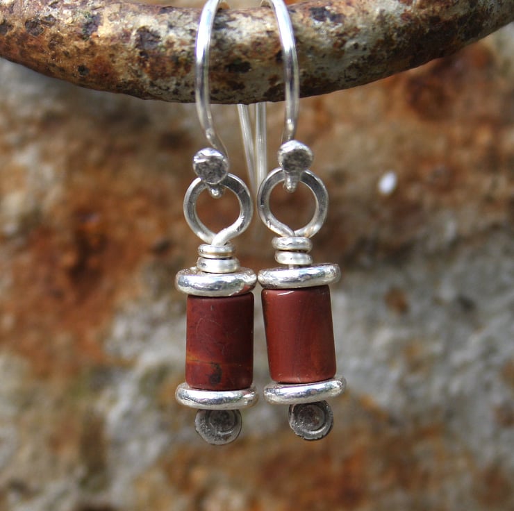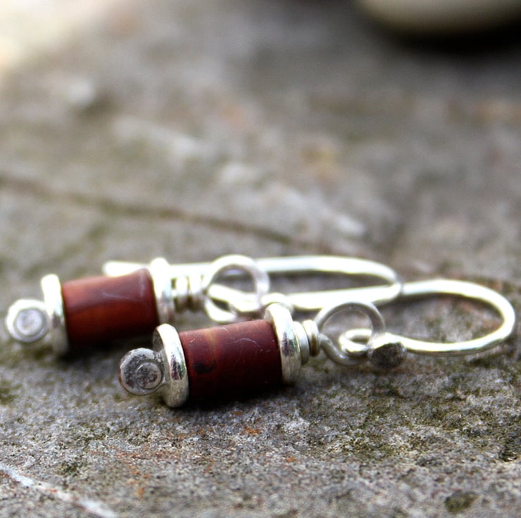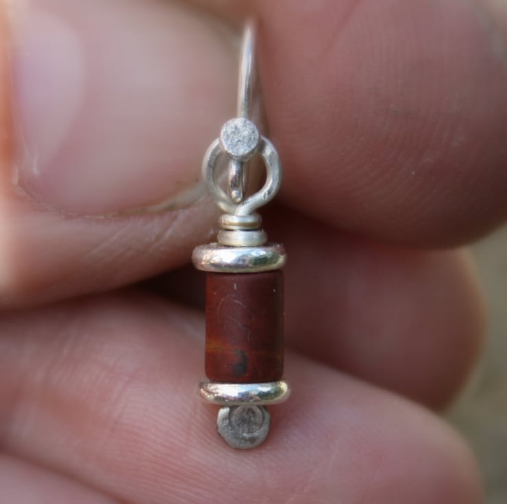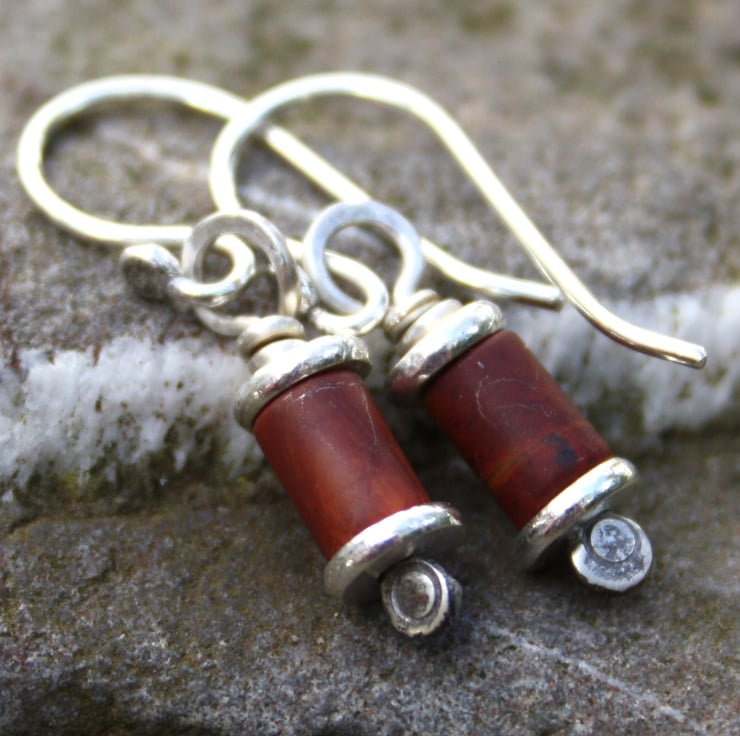 Forged sterling silver pins have been threaded through 5mm silver washer beads and pretty autumnal jasper heishi.