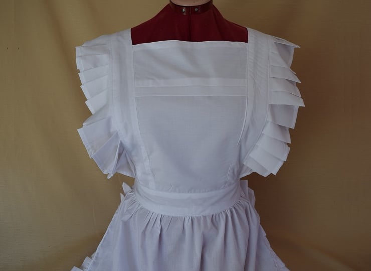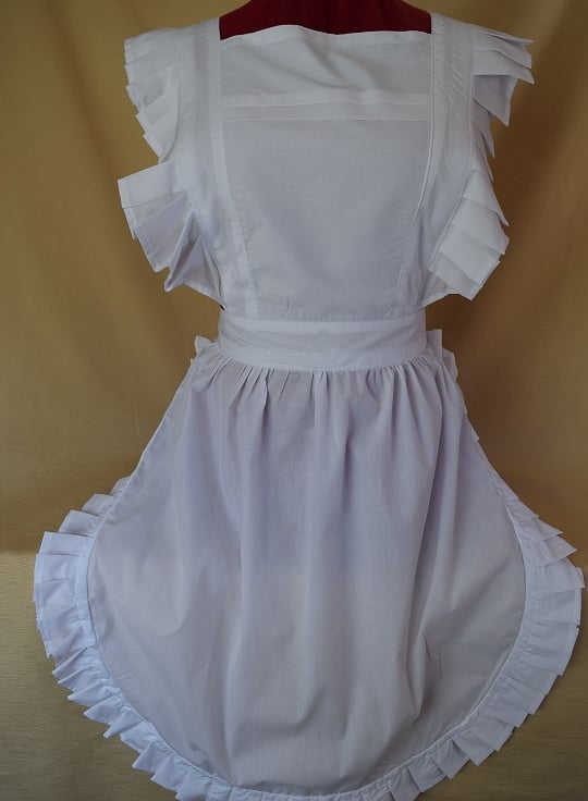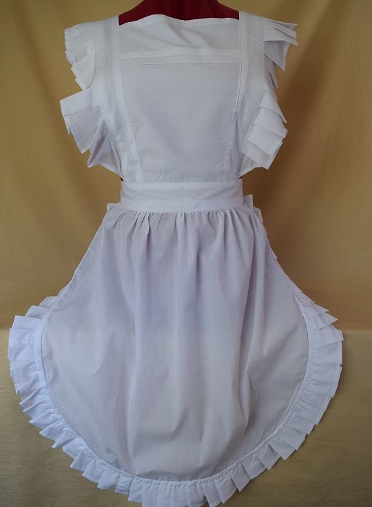Here we have a lovely polycotton, white, retro style apron, handmade in house to our own design. (see photos). Adjustable neck and waist ties so will fit up to a size 22.