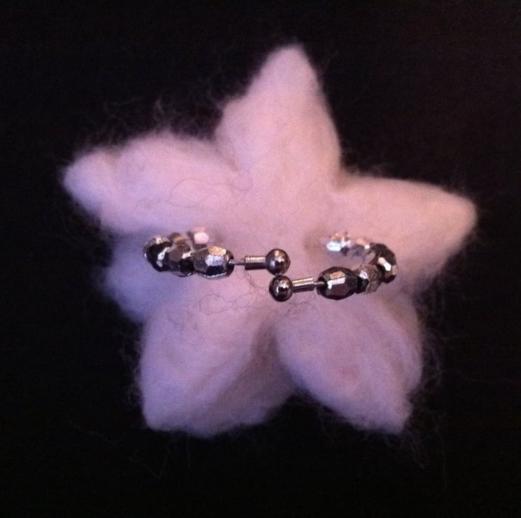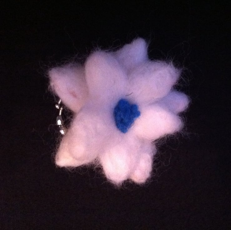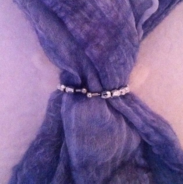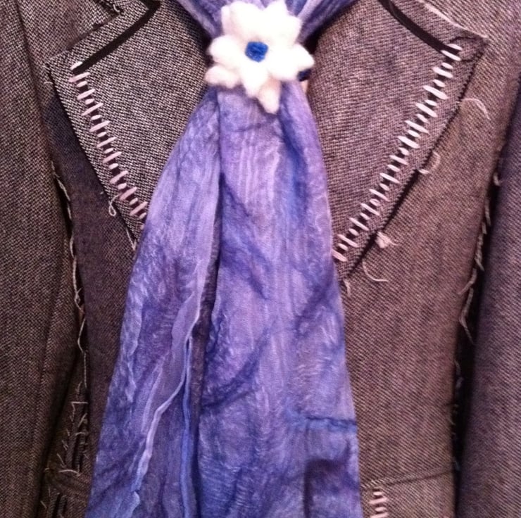 This scarf clip has been designed to secure lightweight, sheer scarves in place. For use when you do not wish to wrap the scarf around your neck but still wish it to be secured. This scarf clip is made from memory wire threaded with silver coloured faceted beads and a central needle felted white flower with blue inner. The clip can be slipped around the scarf without the need to thread the ends of the scarf through and has a diameter ranging from approximately 2.5cm to 3.5cm.