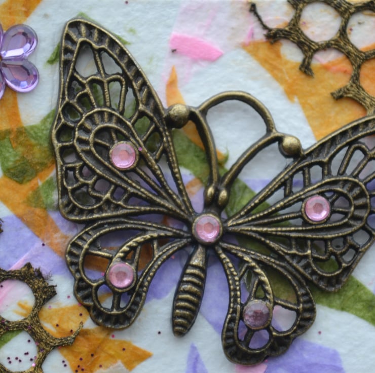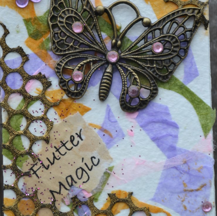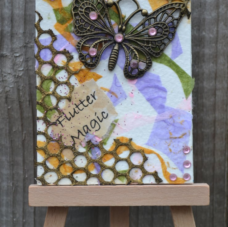 This picture is a mixed media ACEO, which reeds has been decopaged with various colours of mulberry paper, material and embellished with a stunning bronze butterfly and gems.