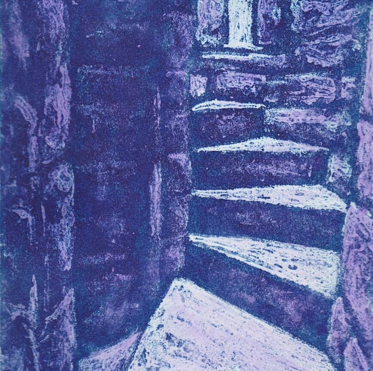 Collagraph Print: Print created from a card plate made by adding glue, paint, enamel etc. This holds the ink in varying degrees and is then printed through the intaglio process.