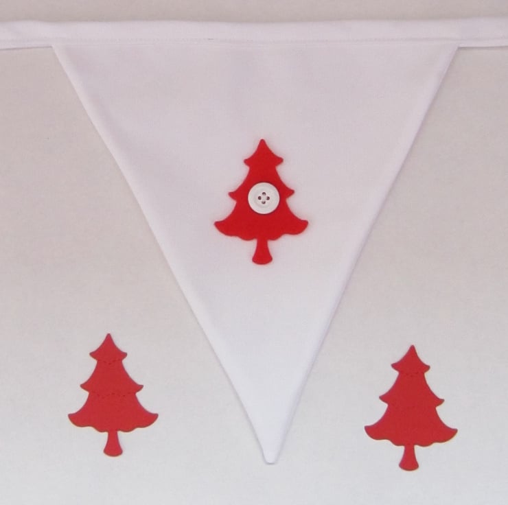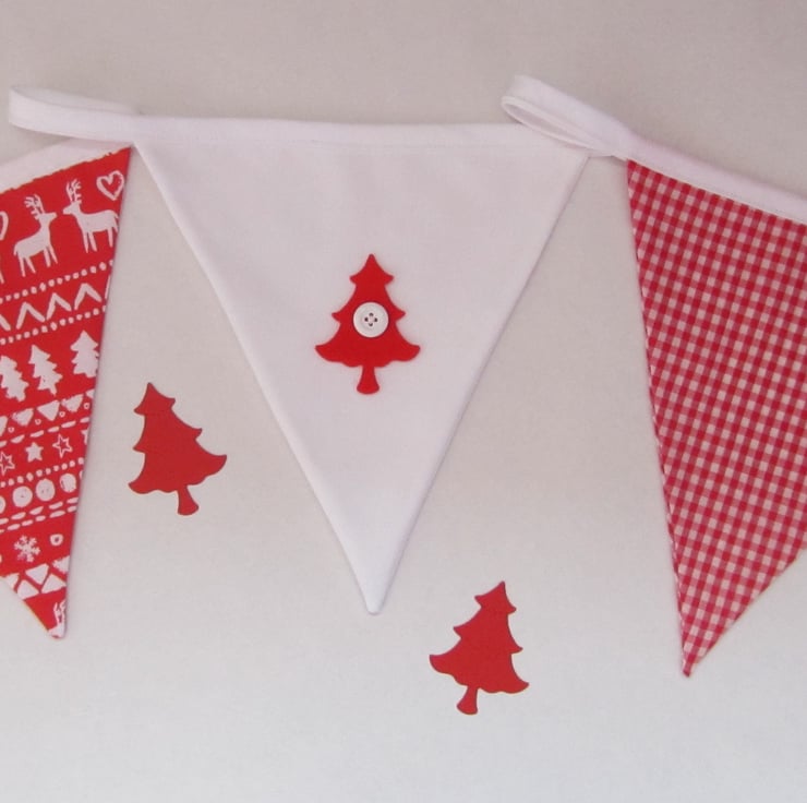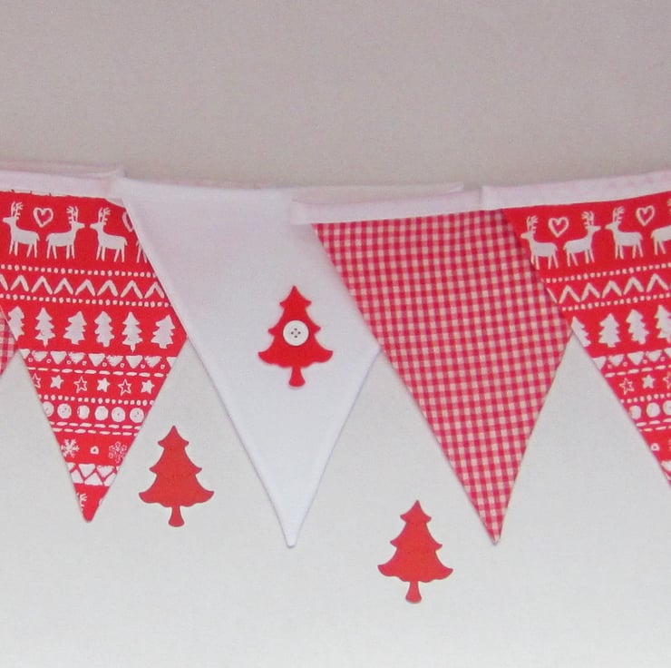 Red and white 9 flag Christmas bunting in 3 different fabric used 3 times; red and white Nordic style featuring stags and trees, red and white gingham and white with a red felt Christmas tree and white button embellishment. The whole string measures nearly 3.5 metres long with flags spaced 12.5 cm apart. It is double sided although the felt Christmas trees are on one side only. Each flag measures 19.5 cm long and 19 cm wide. Edged in white with a loop at each end for hanging.