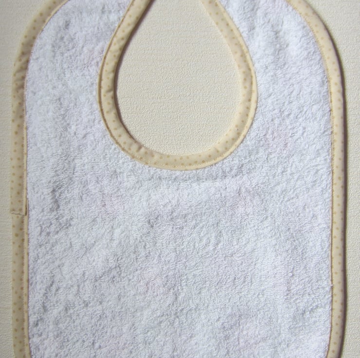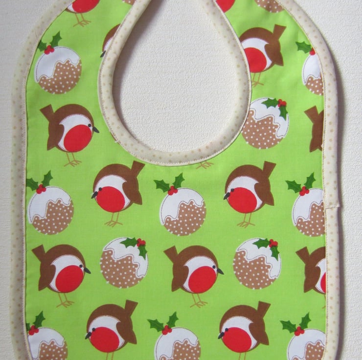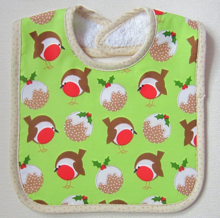Large babies bib in robin and Christmas pudding fabric edged with cream and brown spotty bias binding. Suitable for a baby aged about 12 to 18 months. It measures 25.5 cm wide and 36 cm long. Backed with white towelling and has a velcro fastening at the back of the neck.