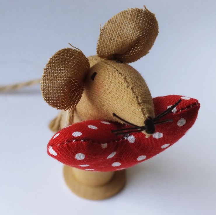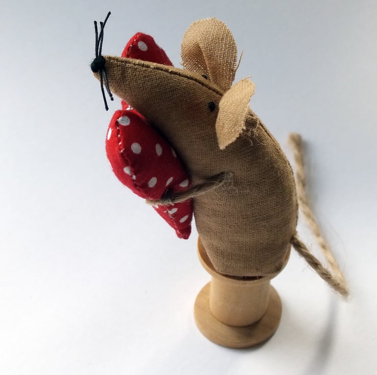 Mousie is made from coffee and cinnamon dyed linen with embroidered features and vintage linen thread whiskers. She is sat on a wooden cotton reel holding a heart made from dotty cotton fabric Her tail and arms are made from jute.