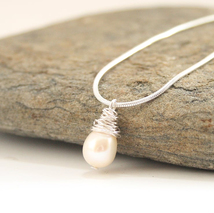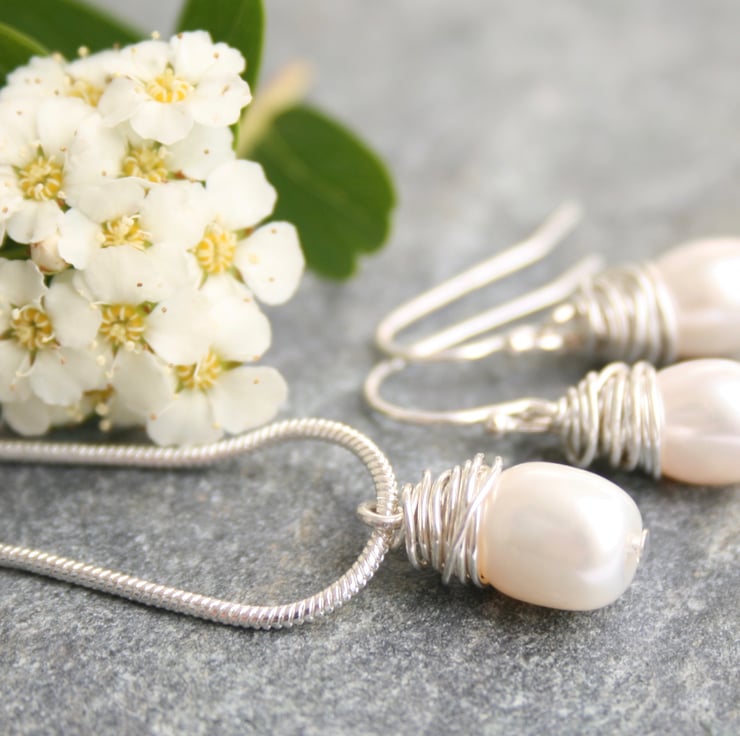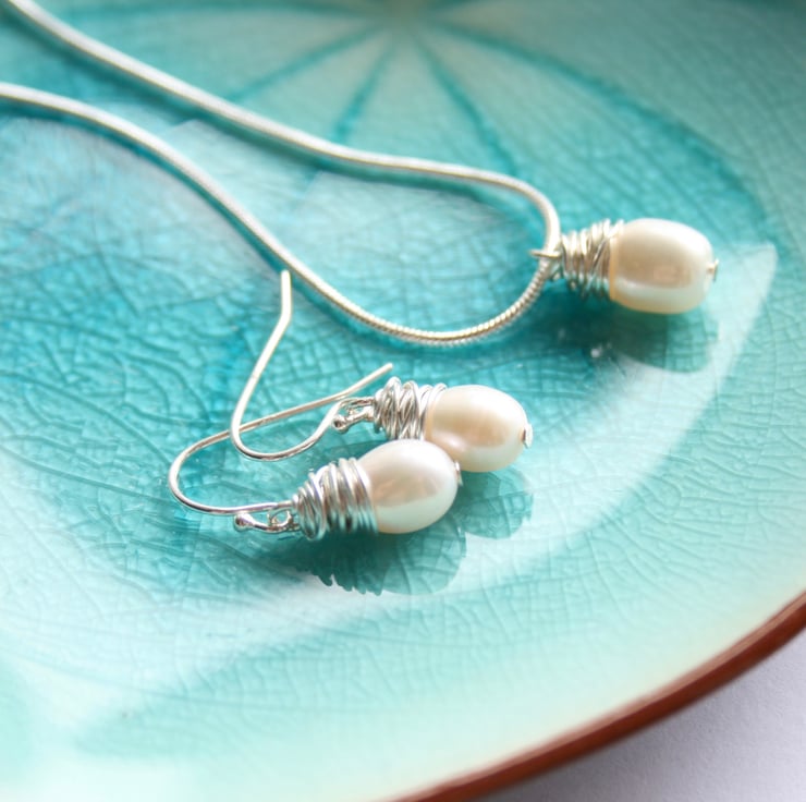 The freshwater pearl hangs from a sterling silver chain, please choose the length that you would like from the menu. The ear wires and the wire wrapped around the pearl are sterling silver.