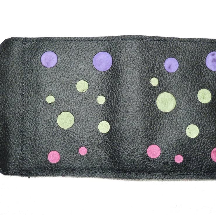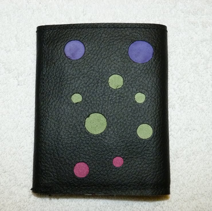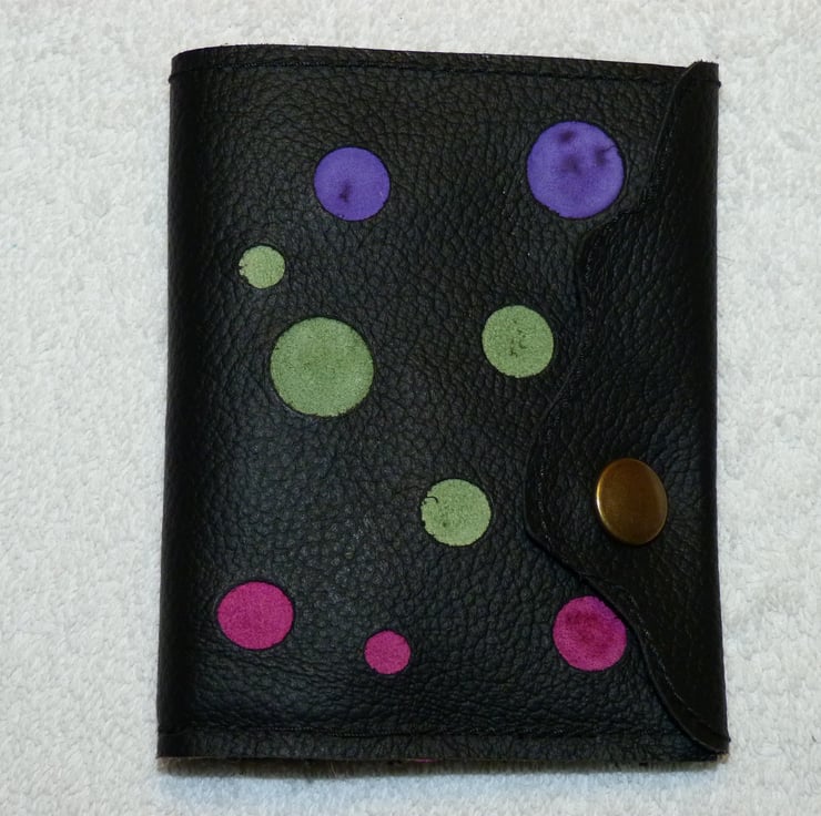 I have created a random circle design on the outer skin of the wallet which has had a contrasting leather piece placed inside to show the design.