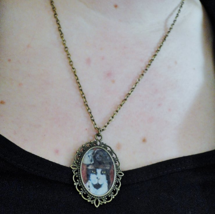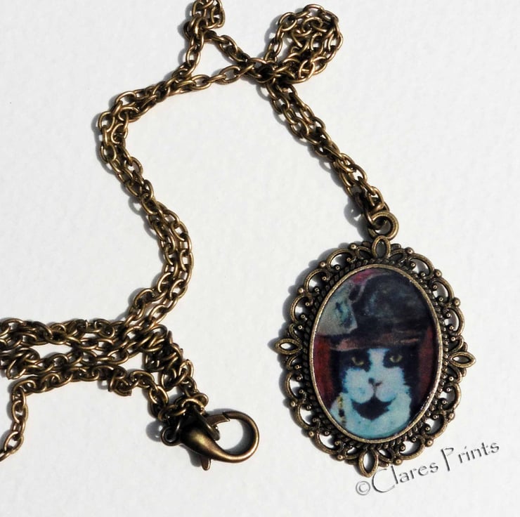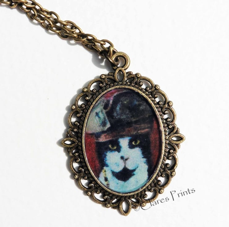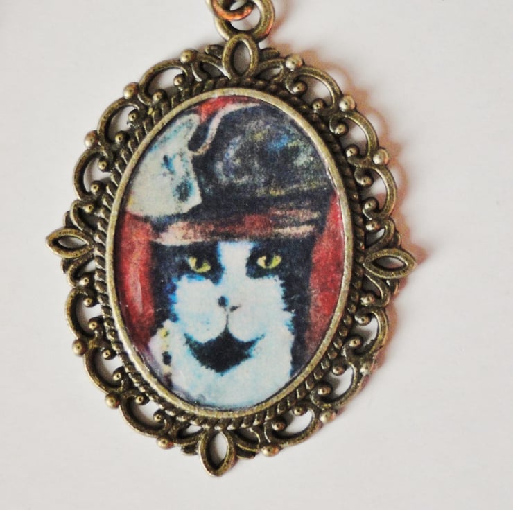 Steampunk Cat Art Necklace featuring artwork from my original oil painting "Captain Jack Cat"