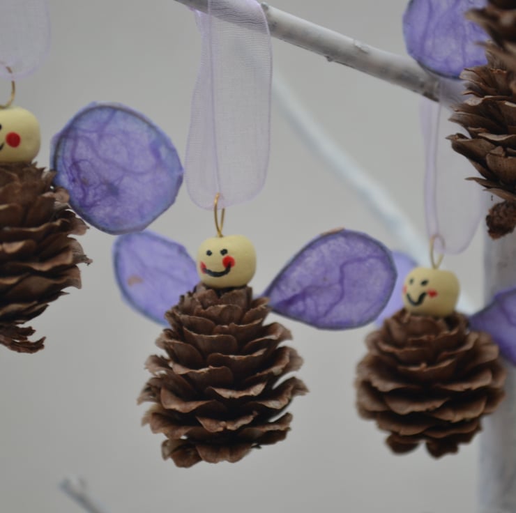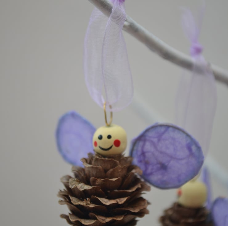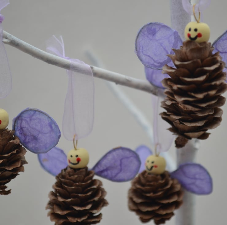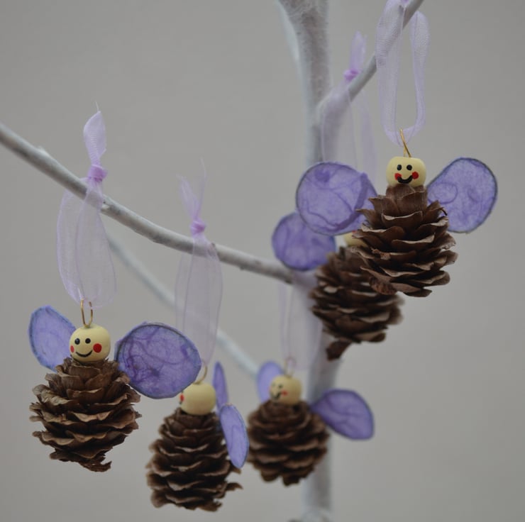 Each fairy has been made with a decorative pine cone, a smiley faced bead and beautifully crafted little glittered wings. They each have lilac ribbon loops to hang them up wherever you like. Each fairy measures approximately 4.5 cm in height (10 cm with string) and the wingspan is approximately 5 cm wide.