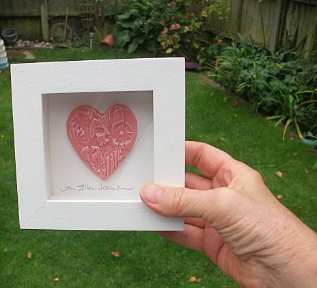 Ceramic pink heart impressed with a floral design. Rustic white wood frame.