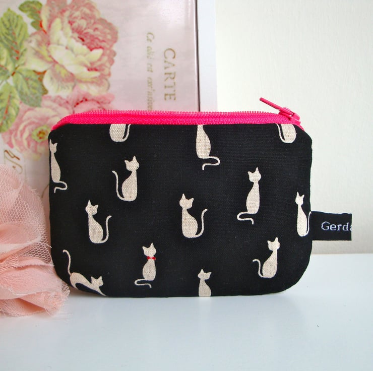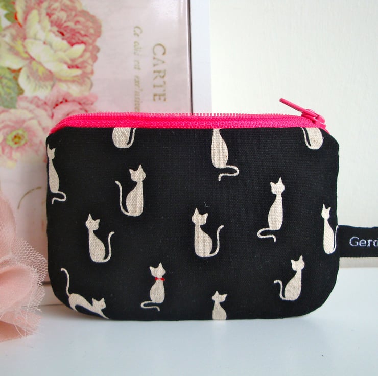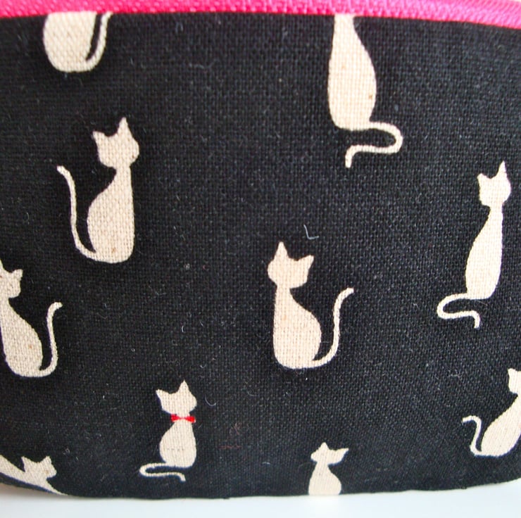 Made in a beautiful black cotton linen fabric , featuring funky cats , with a pink zip across top. Outer fabric has been interfaced- for added body and strength.