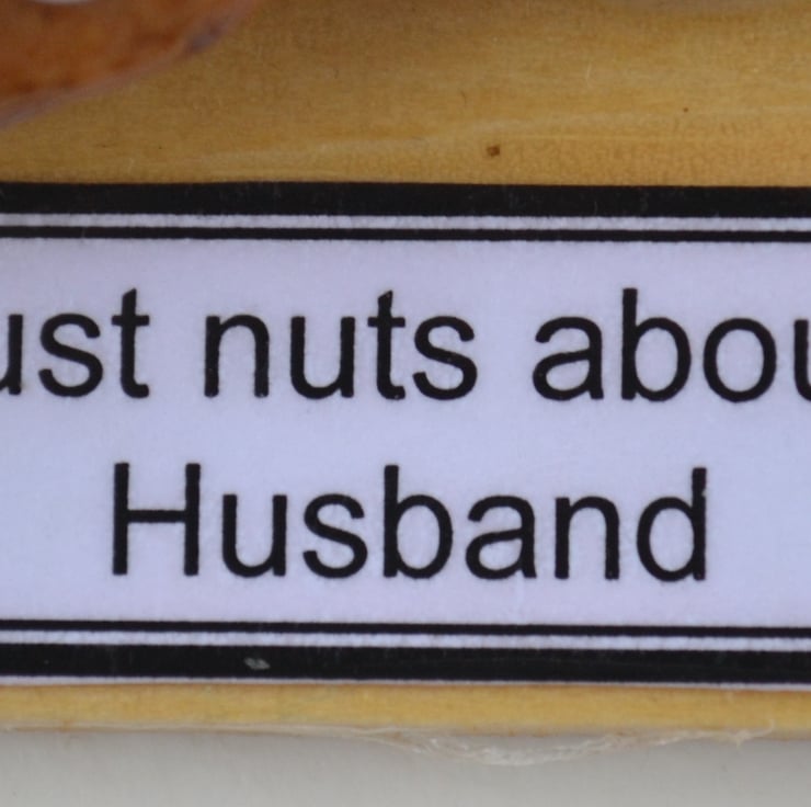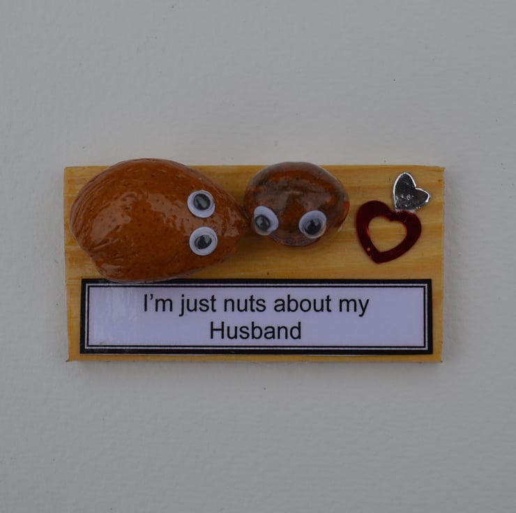 Flat wooden base with two nut people on it, with a unique decoration and message. Messages can be personalised to your requirements to include names, special events, etc.